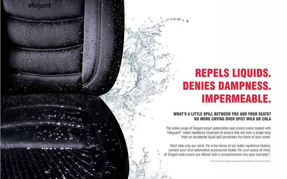 Creative depicting the specialty fabric seats with Fabguard water repellence treatment to prevent spills from dampening fabric.