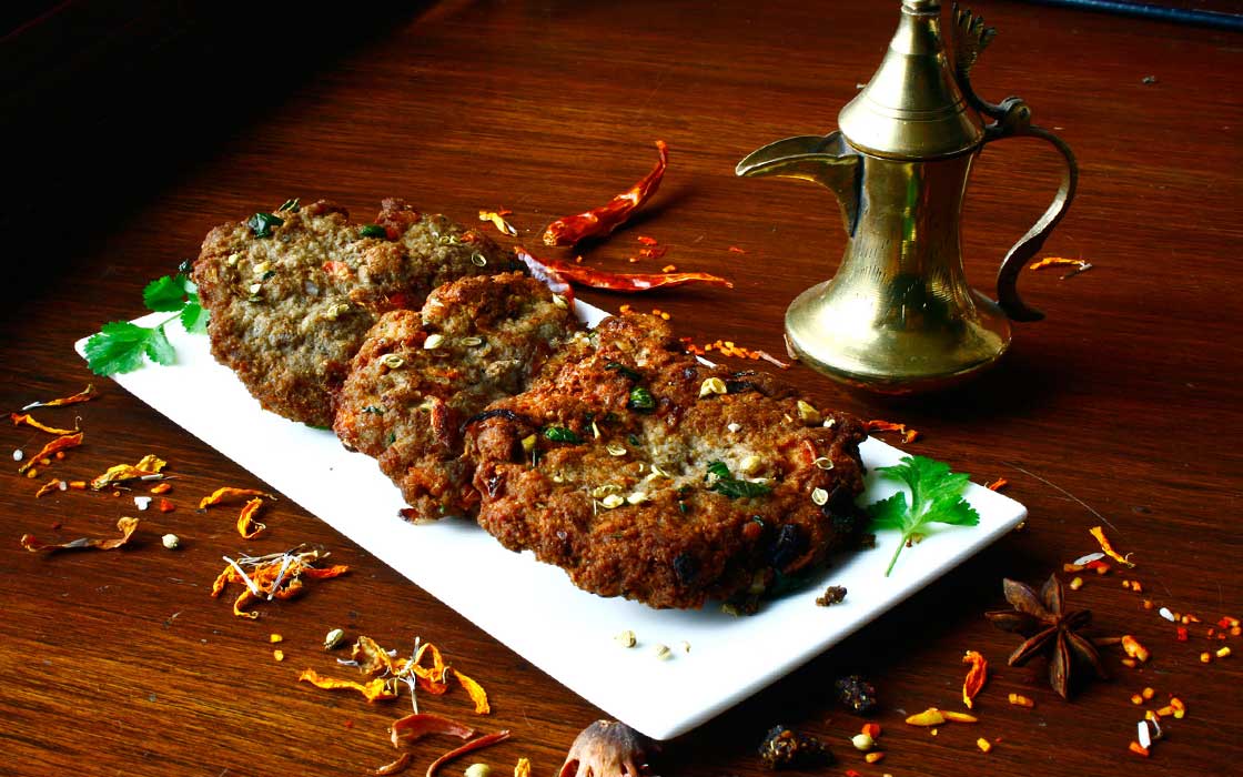 Peshawari Chapli Kabab - Coarsely minced oblong lamb patties mixed with pungent yet mild spices, deep fried in elucidated butter.